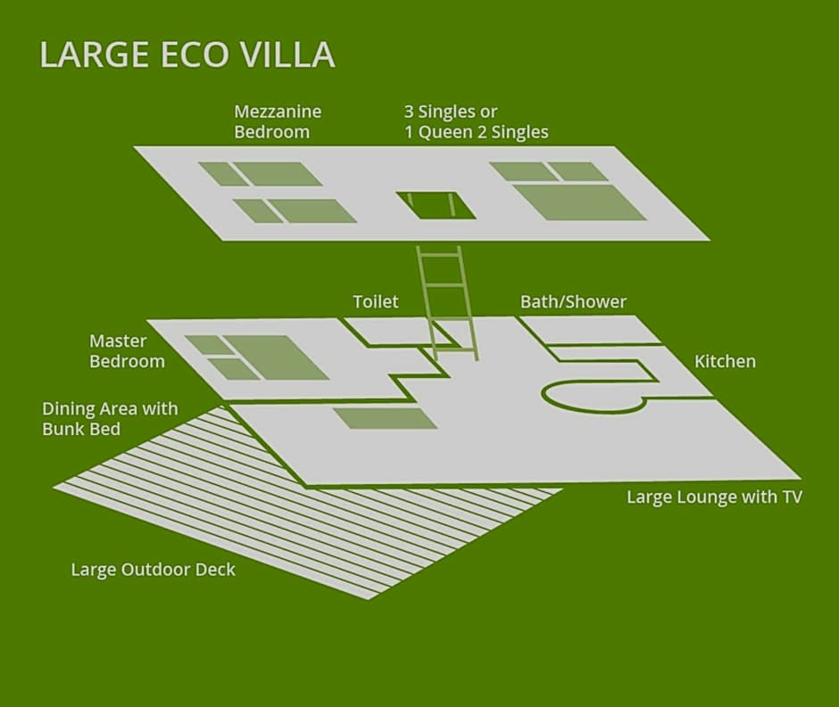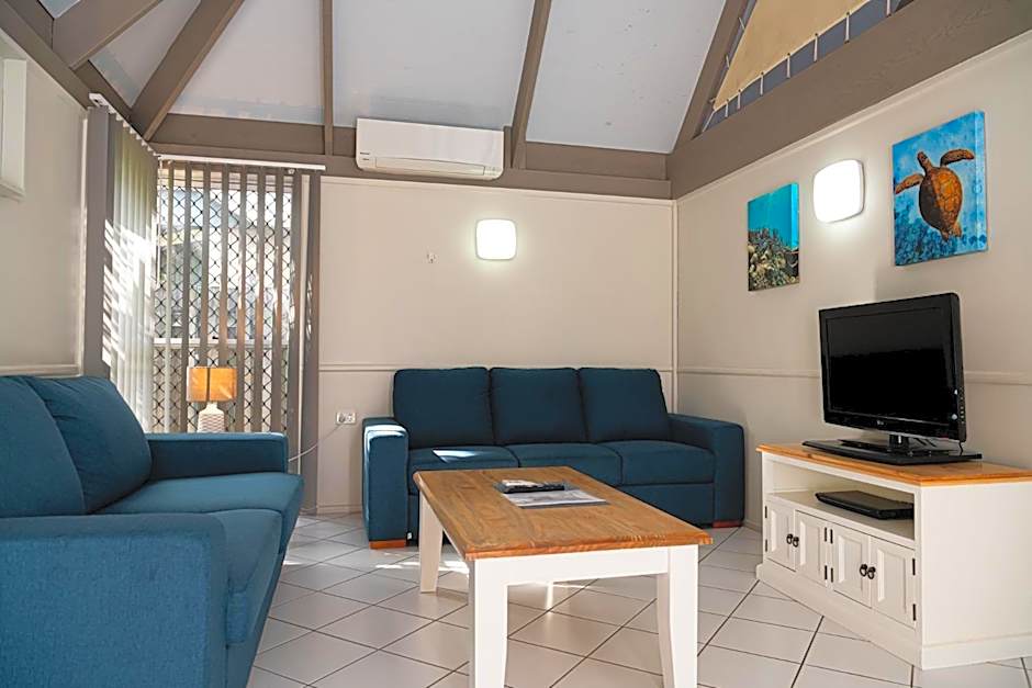 This self-contained villa includes a Master Bedroom down stairs and a loft bedroom upstairs accessible via ladder. It includes a kitchen with a cooktop and microwave (no oven), a spacious lounge area and a separate bathroom and toilet. Linen and bath towels are provided. It features a private veranda and covered parking.